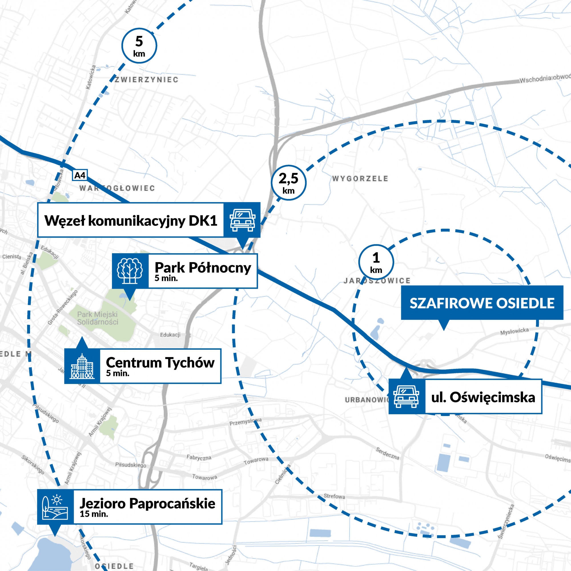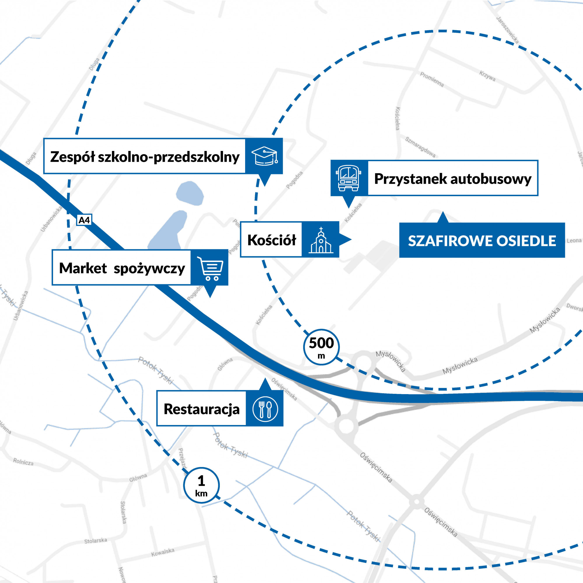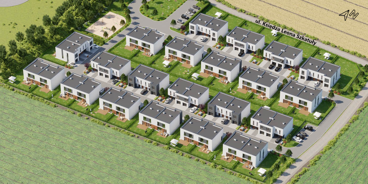 Szafirowe Osiedle obejmuje 21 bliźniaków, czyli łącznie 42 segmenty. Na terenie tej przytulnej enklawy znajduje się m.in. wspólny plac zabaw dla dzieci i siłownia na wolnym powietrzu.